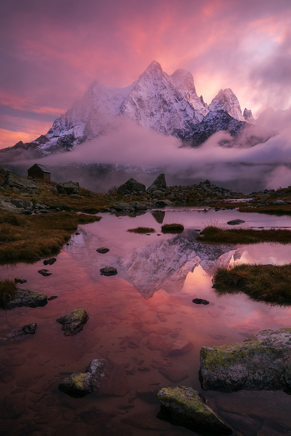Der Sonnenuntergang taucht das Mont-Pelvoux-Massiv in ein sanftes Abendlicht, während sich die Gipfel klar im stillen Wasser spiegeln. Zarte rosa Wolken ziehen wie gemalt über den Himmel, während der Nebel sich im Tal einfidet. Beide verleihen der Szene eine fast unwirkliche Ruhe. Das letzte Abendlicht legt den ersten Schnee und verstärkt die Tiefe der abendlichen Stille, nur unterbrochen von Rufen zweier Fotografen die ihr Glück kaum fassen können, diese Szene erleben zu dürfen. Herbst 2024
