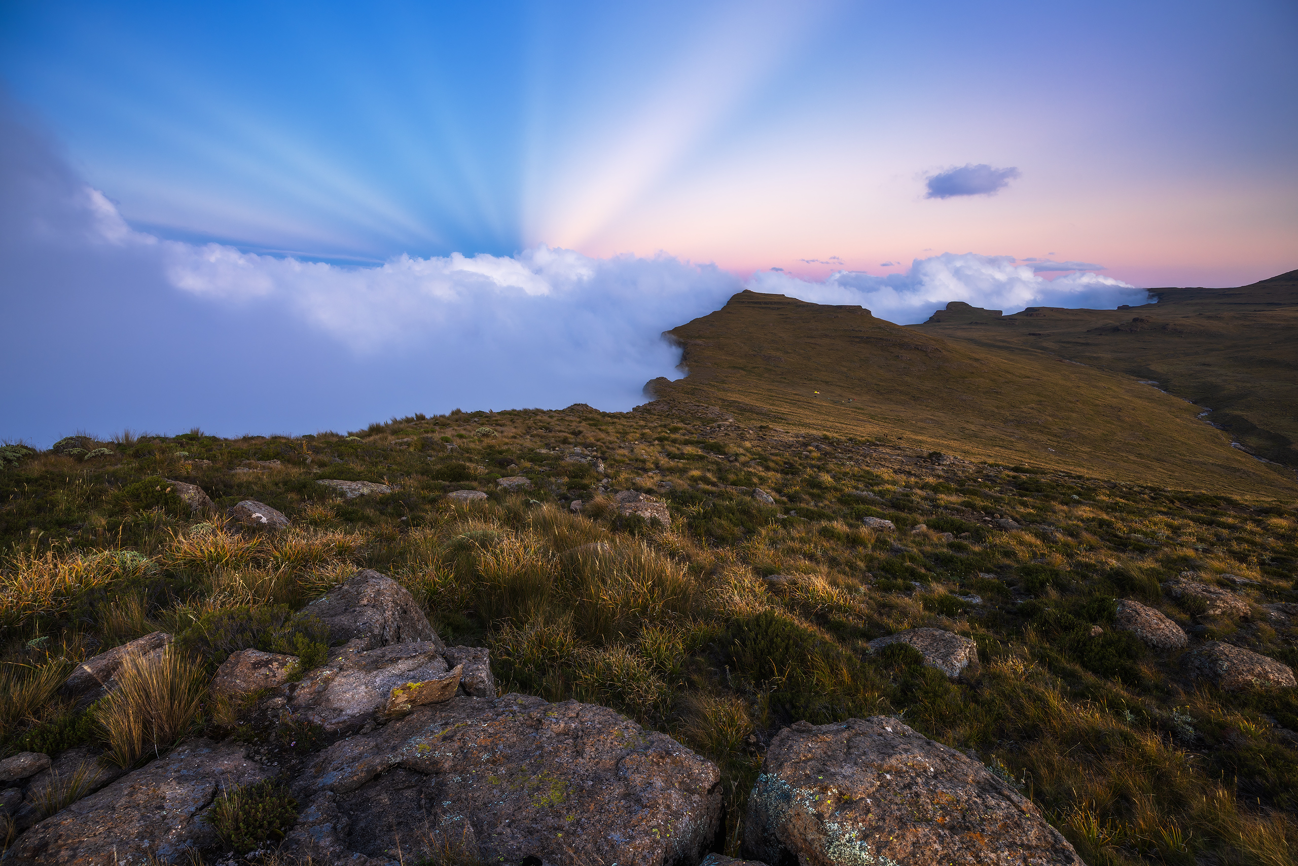Antikrepuslukarstrahlen über dem Drakensberg Plateau an der Grenze zu Lesotho wie diese sieht man dort nicht selten. Die Cumulunimbus Wolken weiter im Westen sorgten für den intensiven Schattenwurf und somit für das spannende Lichtspiel am Himmel. Die Zelte unserer Wandergruppe sind als kleine Farbpunkte in der rechten Bildhälfte erkennbar. Frühling 2023
